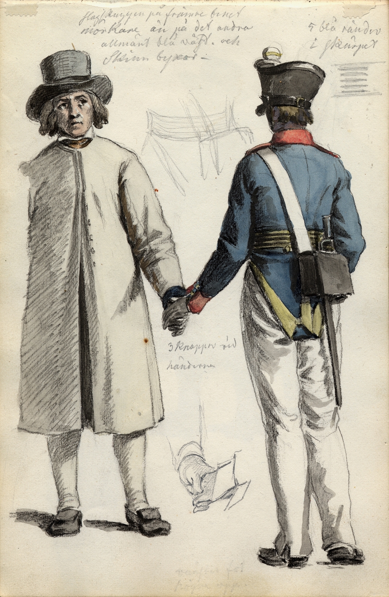 Akvarell. Dräktskisser. Mansdräkt. Två män som tar varandra i hand. detaljskiss av handslaget. "3 knappar vid händerna" Man t. v. i helvit dräkt med svart hatt, framifrån. " Slagknapparna (?) på främre benet mörkare än på det andra, allmänt blå (?) och Skinn byxor" . Man sedd bakifrån iklädd uniform med blå jacka med röda och gula detaljer samt vit byxa. Text "blå ränder i skärpet". Skiss ur skissbok ur Johan Gustaf Sandbergs arkiv, Nordiska museet INV.NR: NM.0080508.