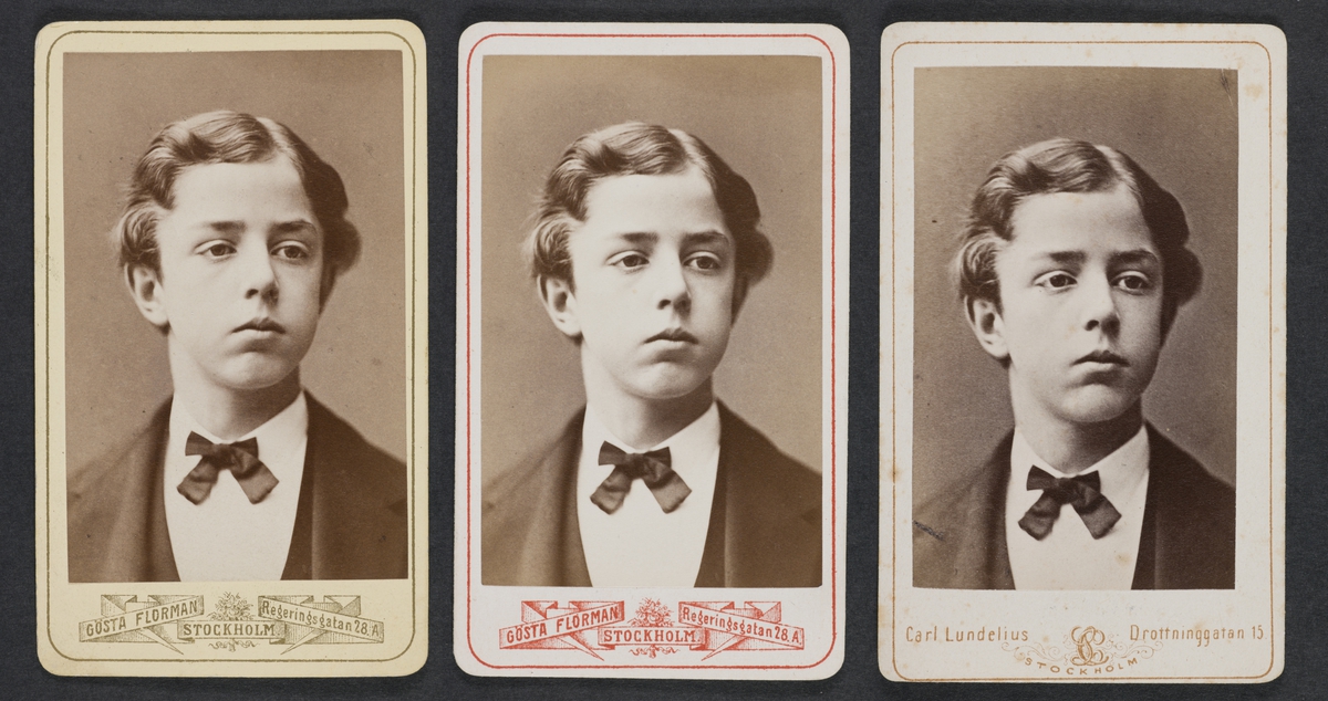 Tre visitkort, ateljéporträtt med identiskt motiv föreställande kronprins Gustaf (sedermera Gustaf V). Ett med prägling från Gösta Flormans ateljé, ett från Carl Lundelius samt ett omärkt.