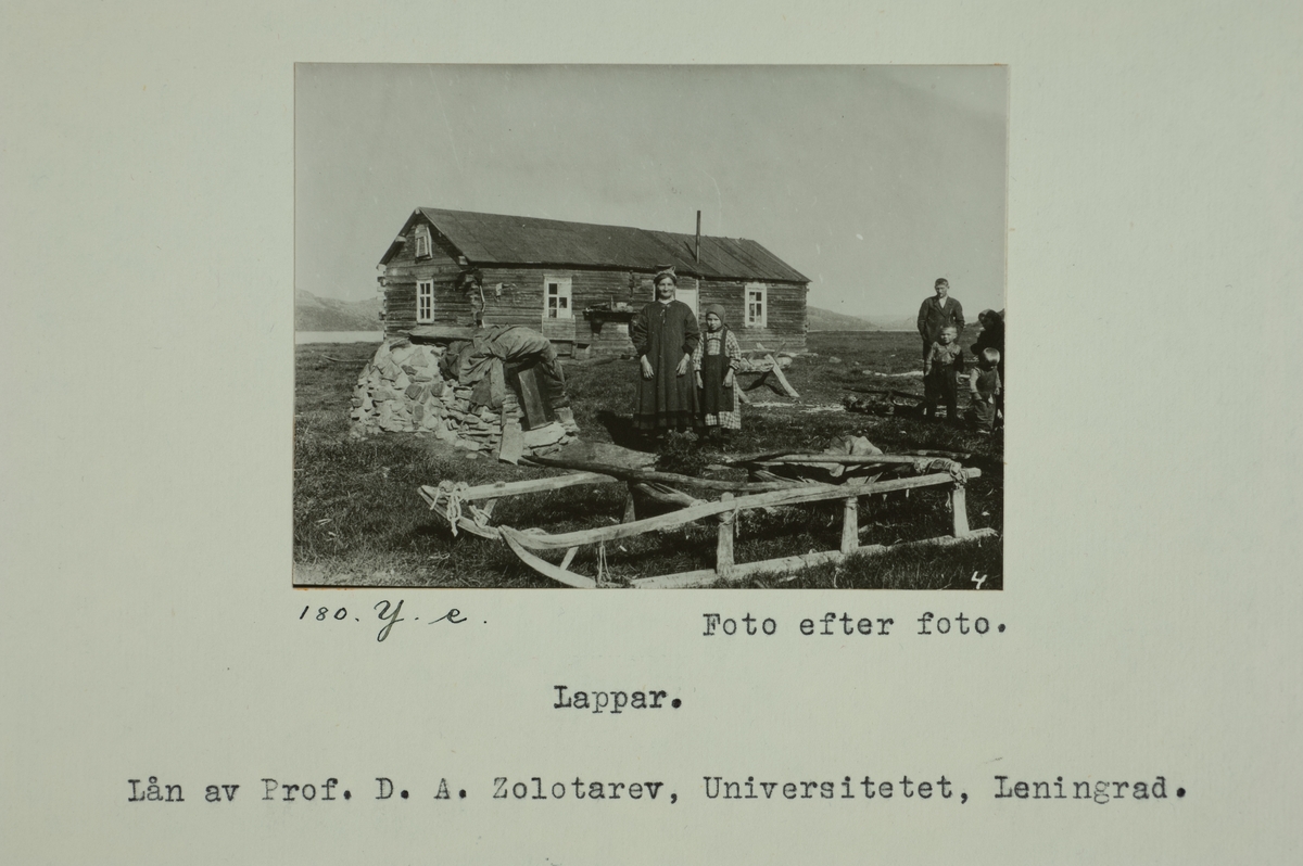 Ark med monterat foto och text: "Lappar. Foto efter foto." En familj framför ett hus. En släde i förgrunden. Fotot lånades in från Universitetet i Leningrad för reprofotografering.