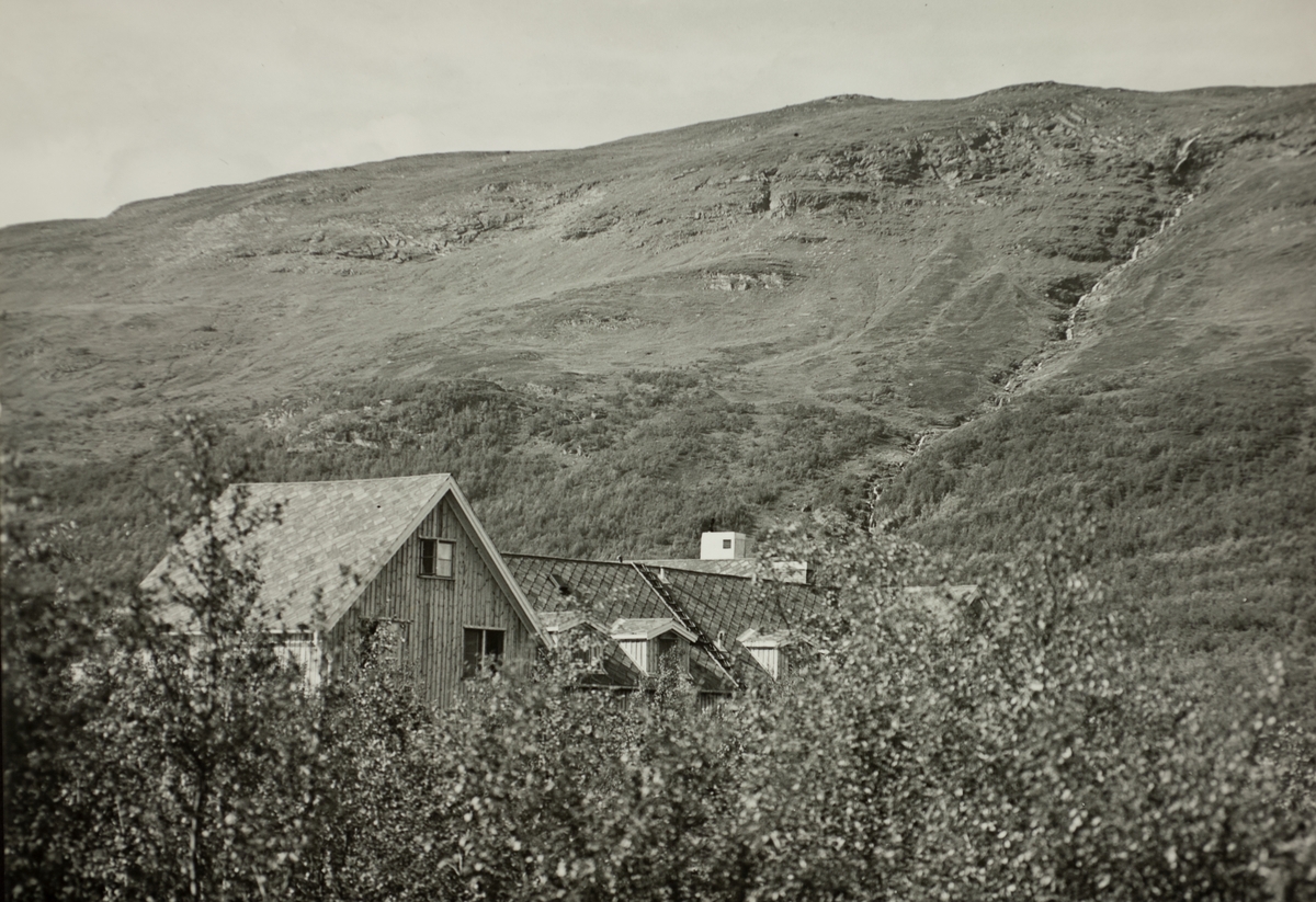 Abisko turiststation, nedan Njullá. Ett vattenfall rinner nedför berget.