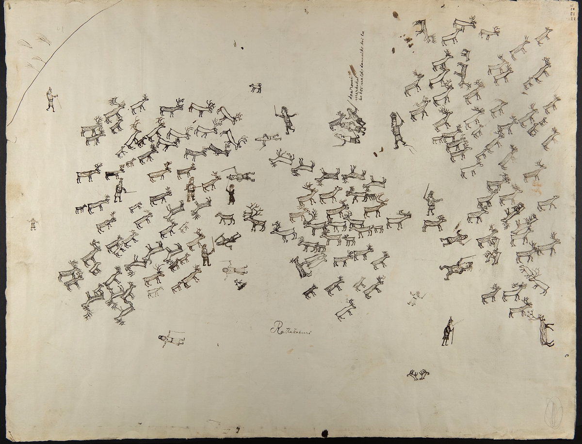 Teckning av Johan Turi. "Skilda lappmarker". Samer med hundar driver en renhjord. L.A. 874 nr. 19.