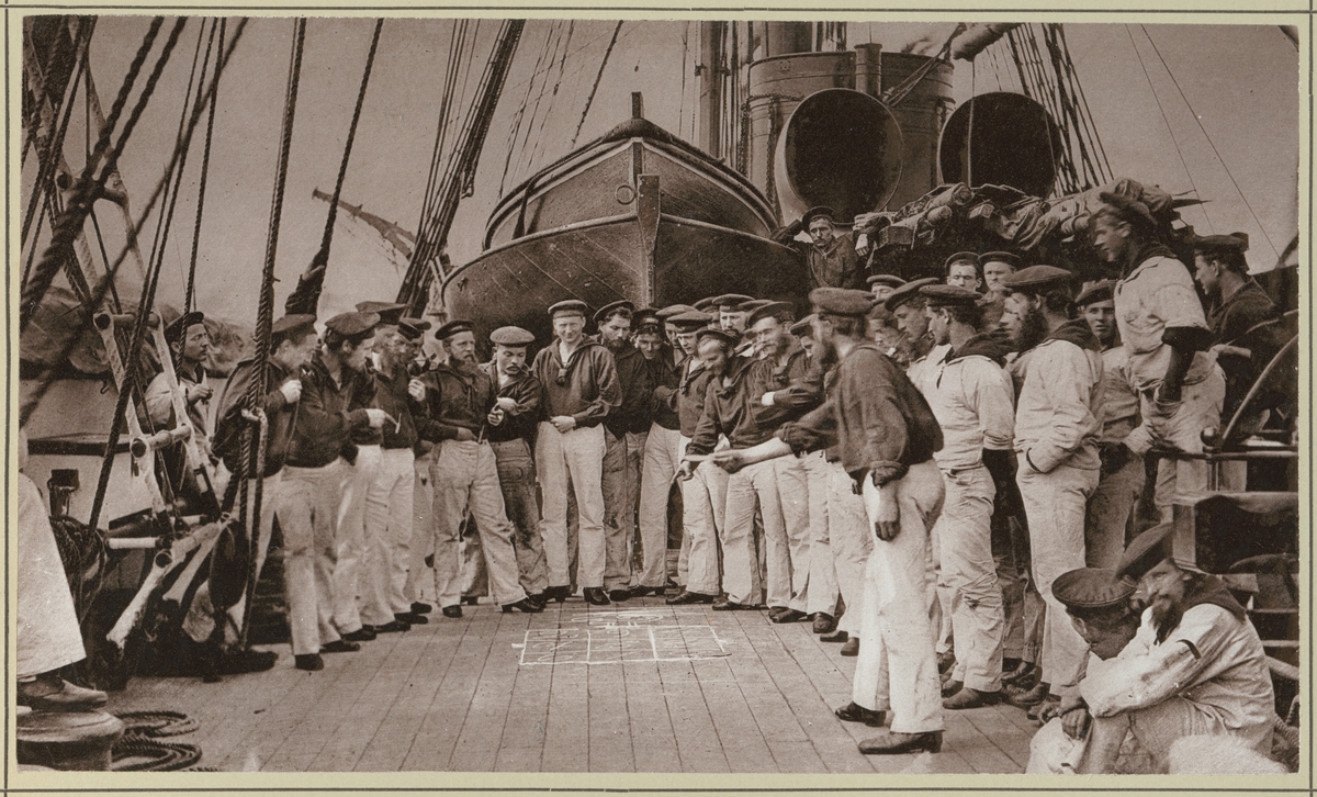 Bilden visar manskapet ombord på korvetten Stosch som njuter av fritiden med en lek som heter "Bleilatsch". Här kastar en spelare blyplattor i ett spelfält med rutor och siffror. Han måste träffa vissa fält efter förutbestämda regler. Spelet var populärt i sjöfarten eftersom skeppets rörelser gjorde resultatet oförutsebart.