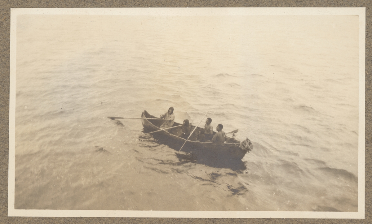 Titel: Bilden visar en roddbåt med fem indianer som tittar upp mot Fylgia.