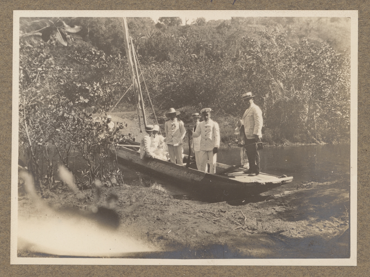 Sex befäl från fylgia har tagit uppställning för ett gruppkort i en segelbåt i skogen. De är klädd i vita uniformer och halmhattar. Mannen i mitten har ett gevär.