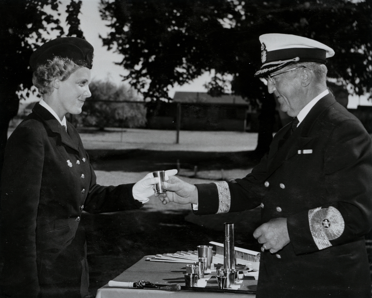 Titel: Konteramiral Samuelson överlämnar en pokal till en lotta. Båda är klädda i uniform.
