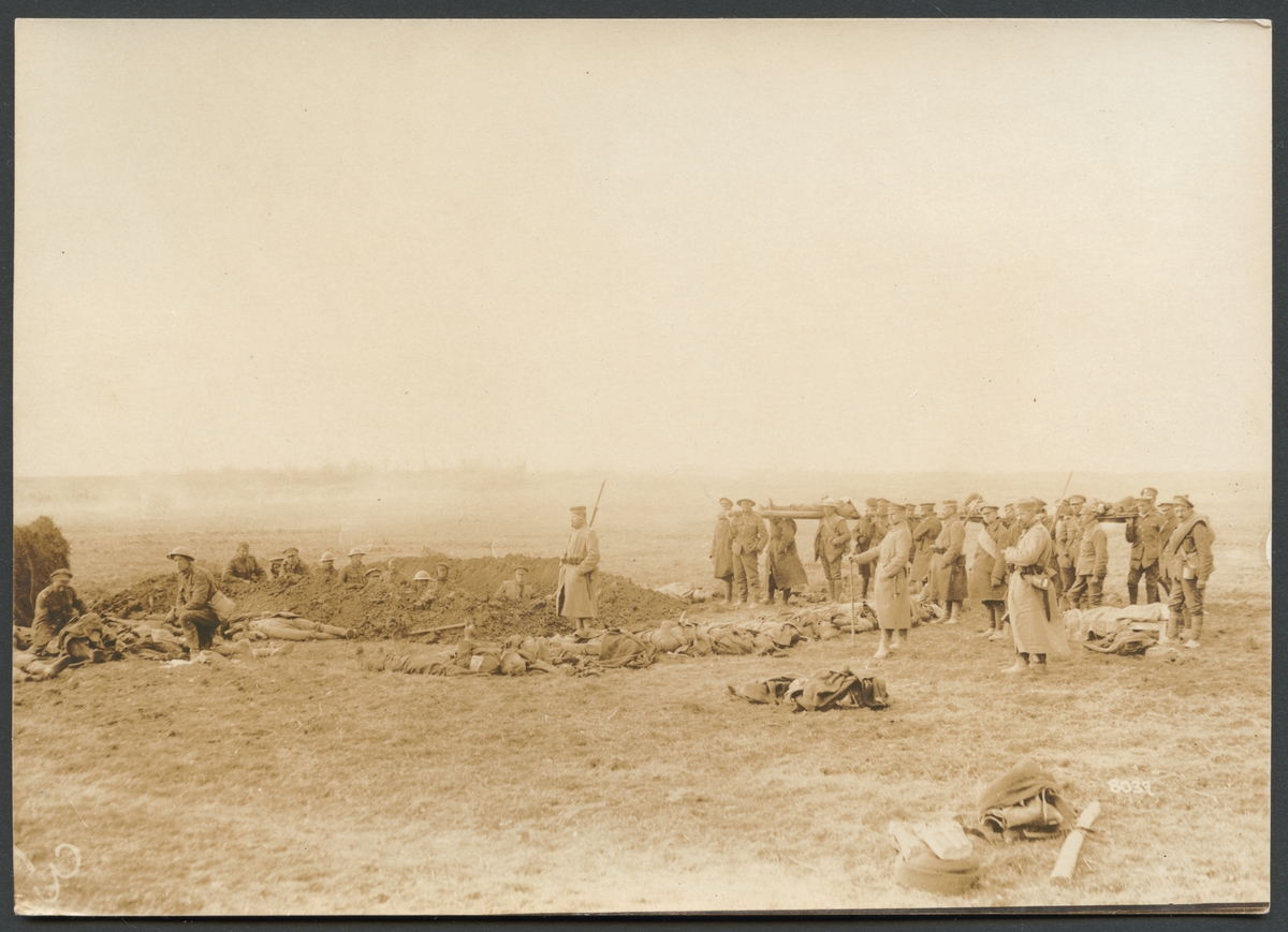 Bilden visar hur en massgrav grävs ut. Inför gropen ligger en rad stupade soldater. På höger sidan syns en grupp soldater som bär fler döda till platsen.