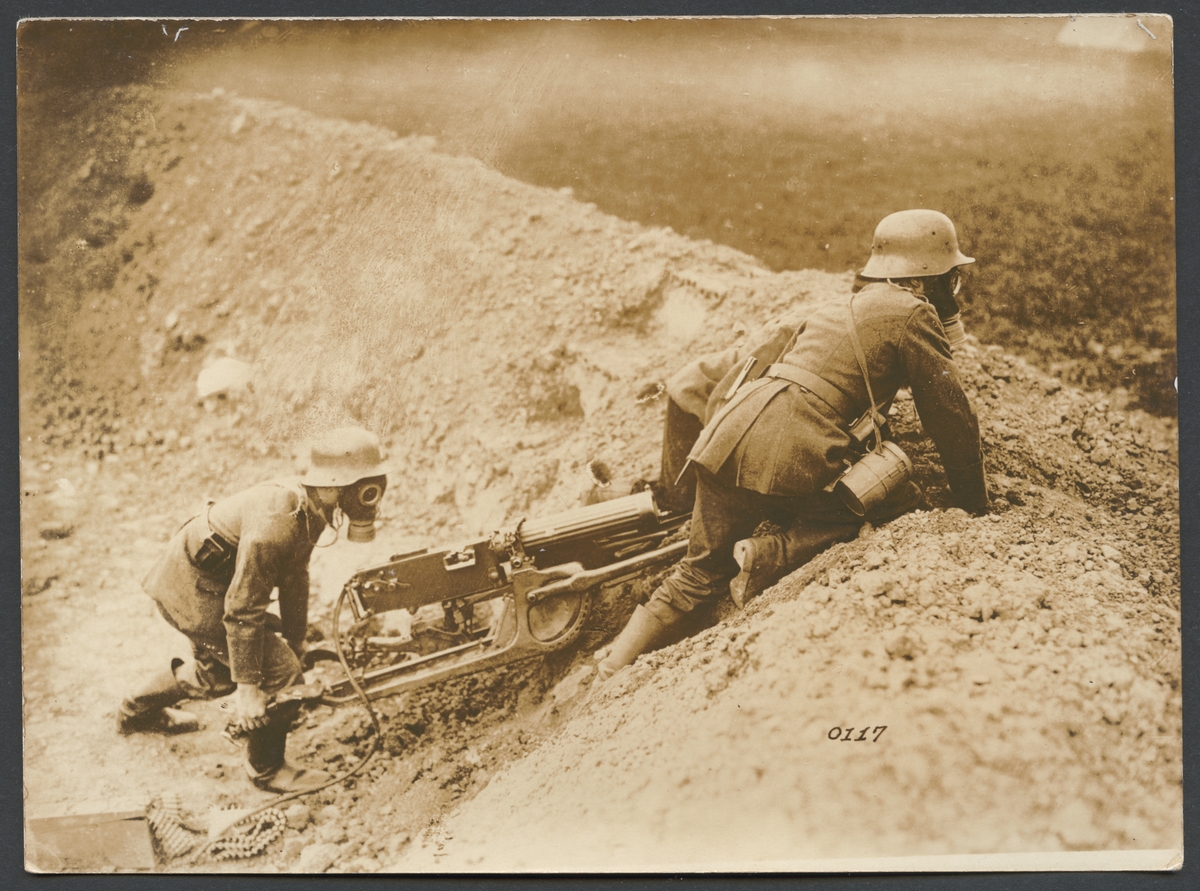 Bilden visar två soldater som från skyddet av en skyttegrav försöker rycker fram med en kulspruta. Båda män bär gasmasker