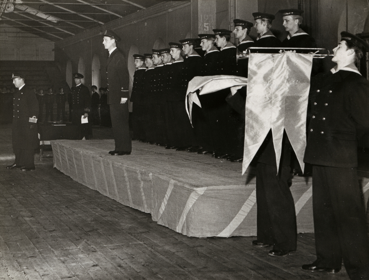 Medaljutdelning till matroser. Framför maskapet står sjöbefäl och förgrunden blåser sjömän i två trumpeter.