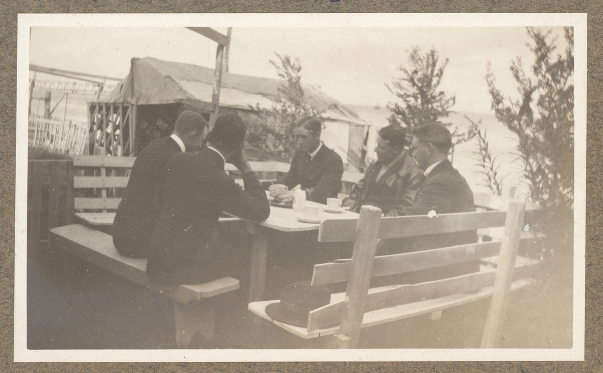 Titel: Fem finklädda herrar ta en fikarast utomhus.