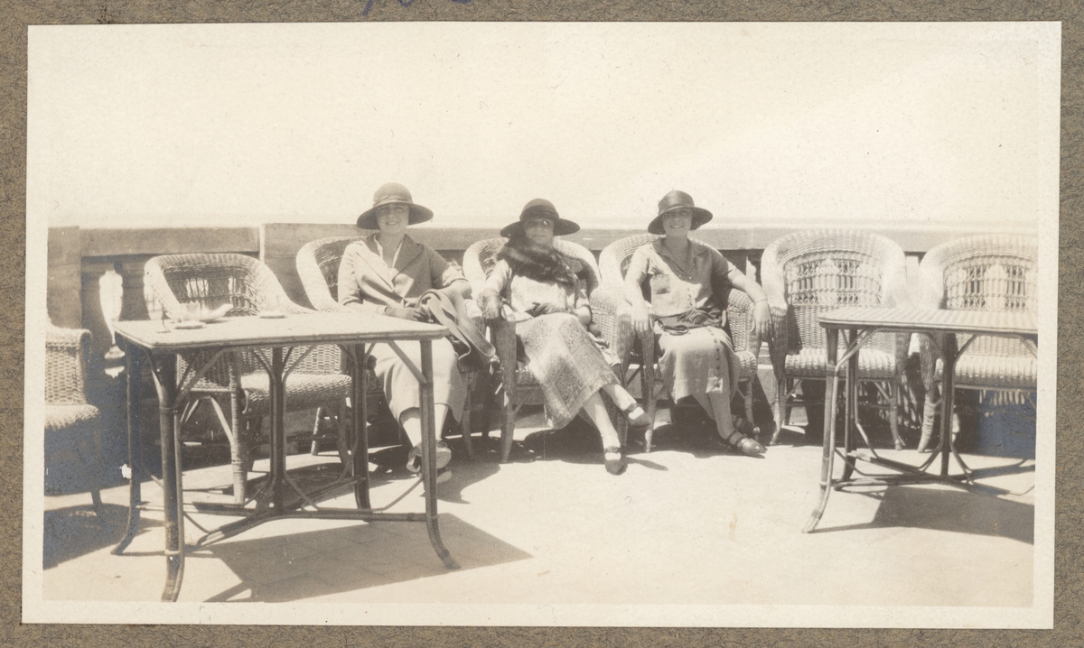 Titel: Tre finklädda damer med hattar sitter i korgstolar.