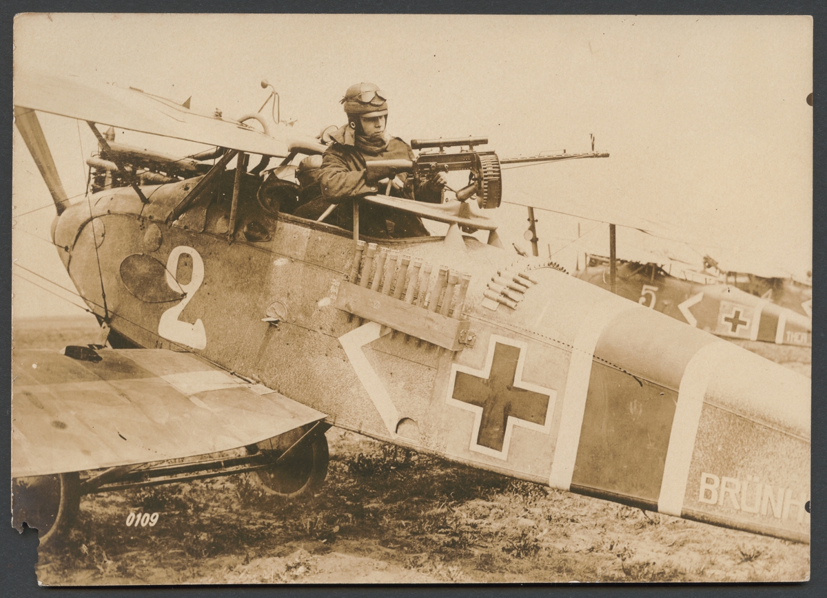 Bilden visar en stridspilot som hanterar med en kulspruta ombord på ett stridsflygplan. På sidan och ovanpå planet ser man hållare med handgranater. Flygplanet som står på marken är döpt på namn "Brünhilde". I bakgrunden syns en systerflygplan med namn "Thea".