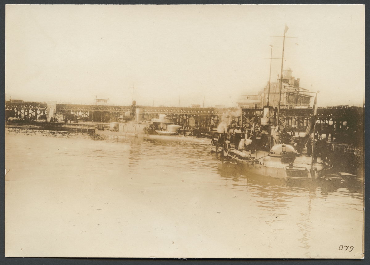 Bilden visar hamnbassängen i Odessa med ett flertal örlogsskepp som ligger förtöjda vid kajen. I bakgrunden syns en stor träbro.