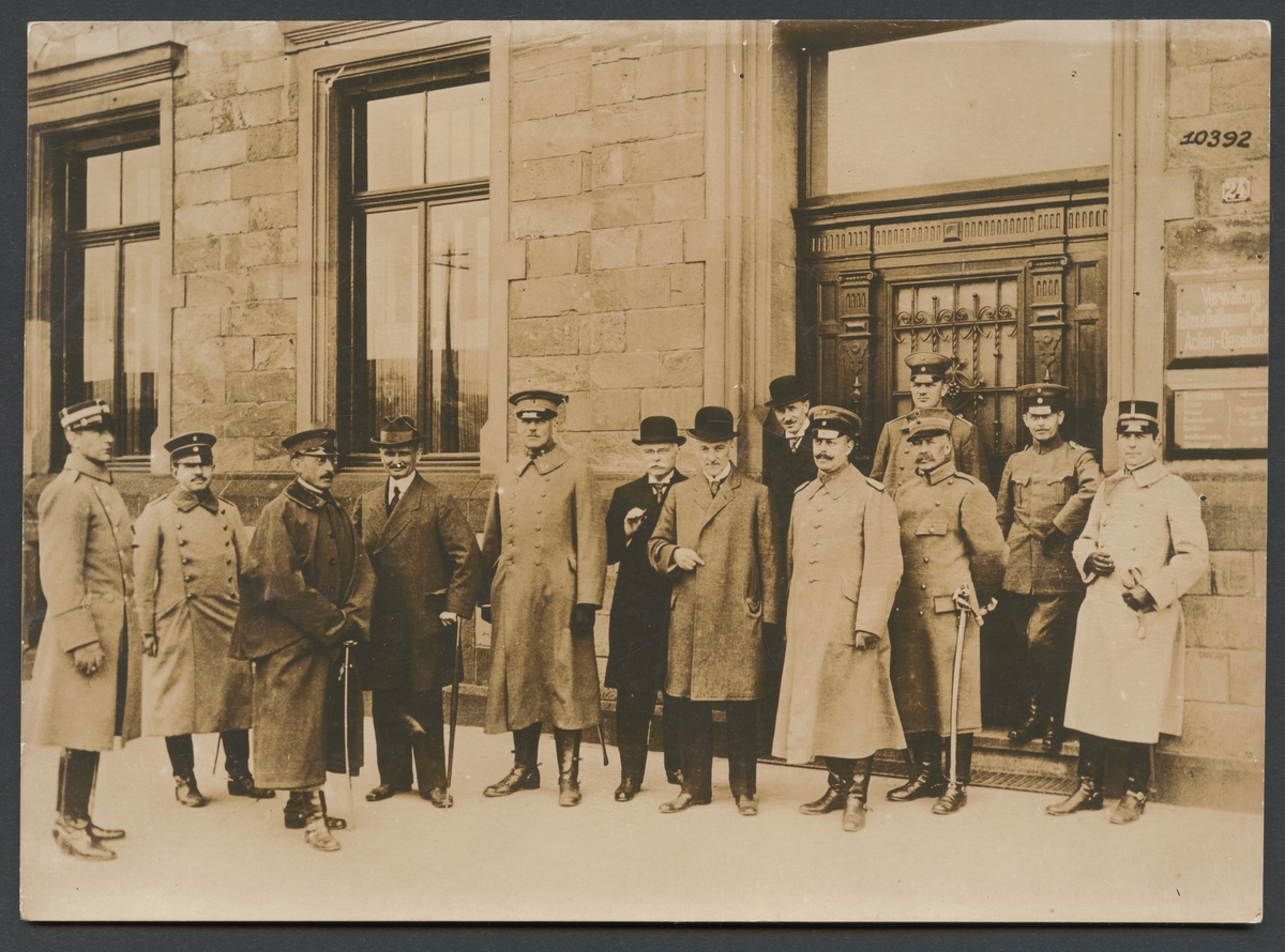 Fotografiet förställer ett grupporträtt av militärer och civila personer framför en byggnad. Skylten på höger sidan talar om att det är "Verwaltung Felten & Guilleaume Carlswerk Actien Gesellschaft".