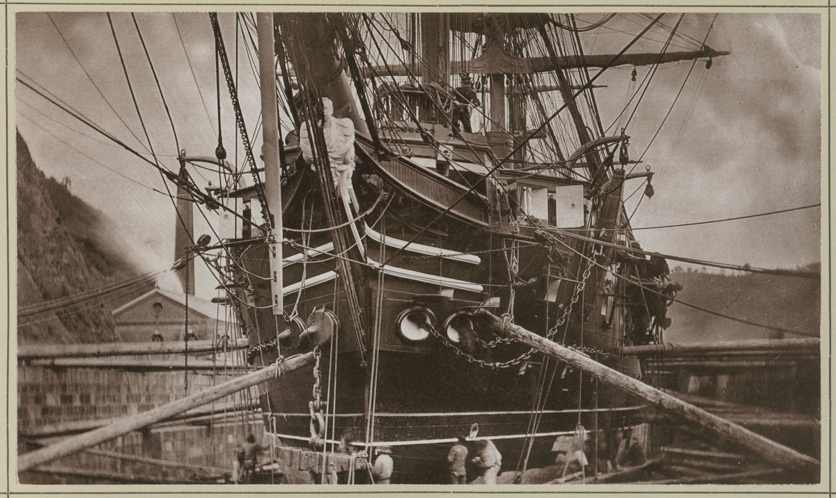 Bilden förställer stöttningen av korvetten Stosch i torrdockan.