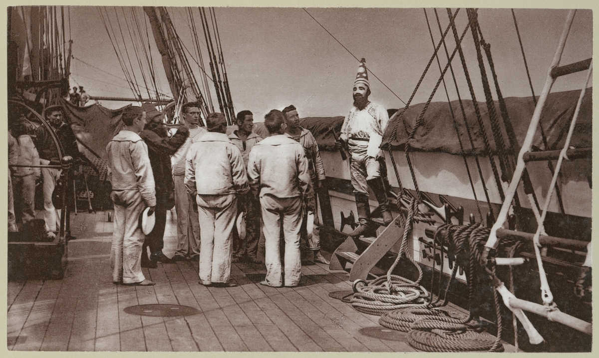 Bilden visar en scen ur linjedopet ombord på korvetten Stosch. En dag före ceremonin kommer Triton, en sändebud av Neptun, ombord för bebåda Neptuns ankomst nästa dagen.