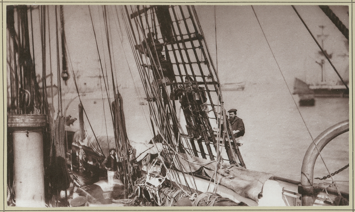 Bilden visar manskapet ombord på korvetten Stosch som är sysselsatt med underhållsarbeten på skeppet. Här håller de på med tackelarbete. I vanterna ersätts de gamla stegen med nya.