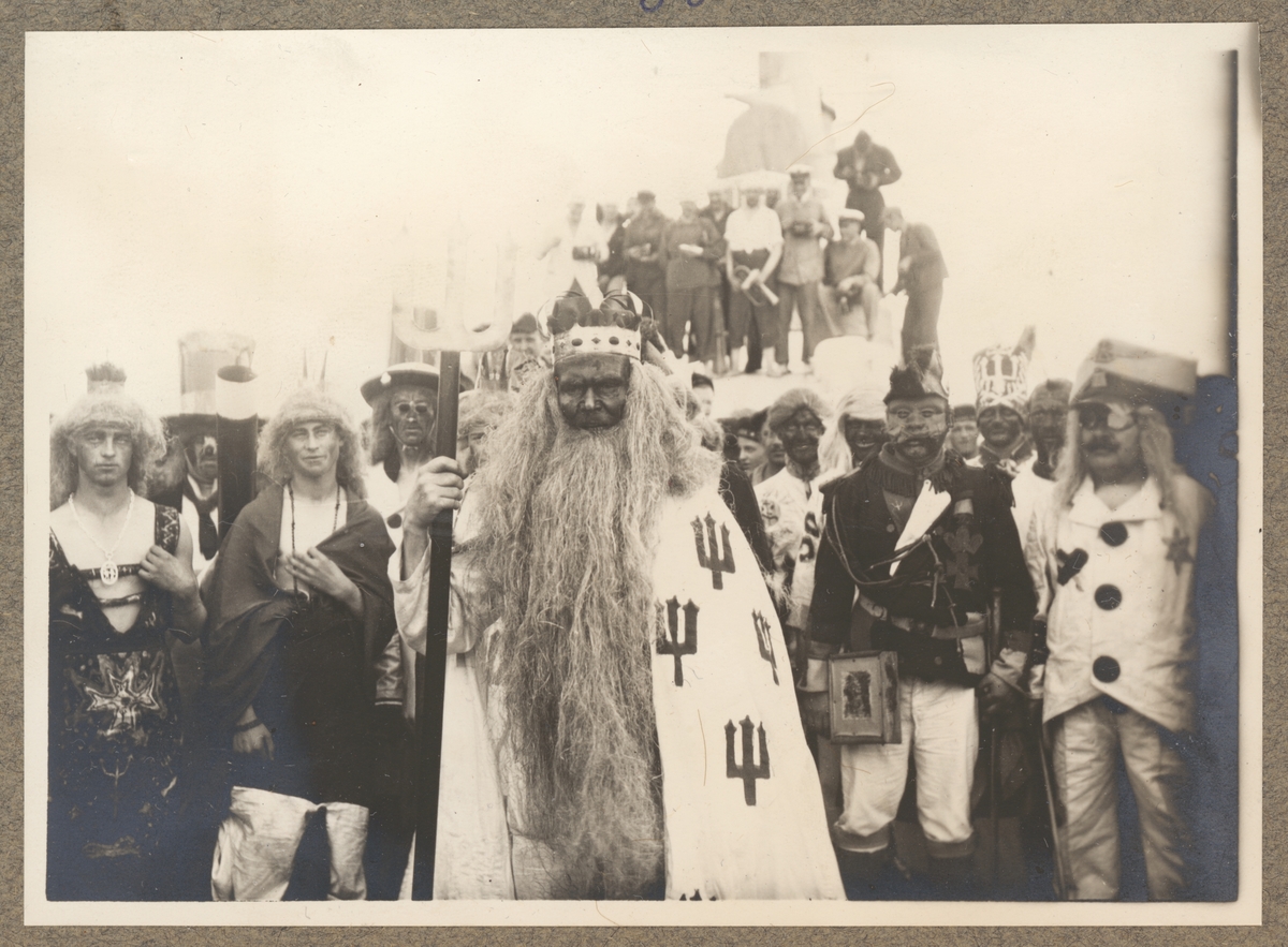 Titel: Bilden föreställer havet kung Neptun med hovstat under linjedopet ombord på Fylgia.