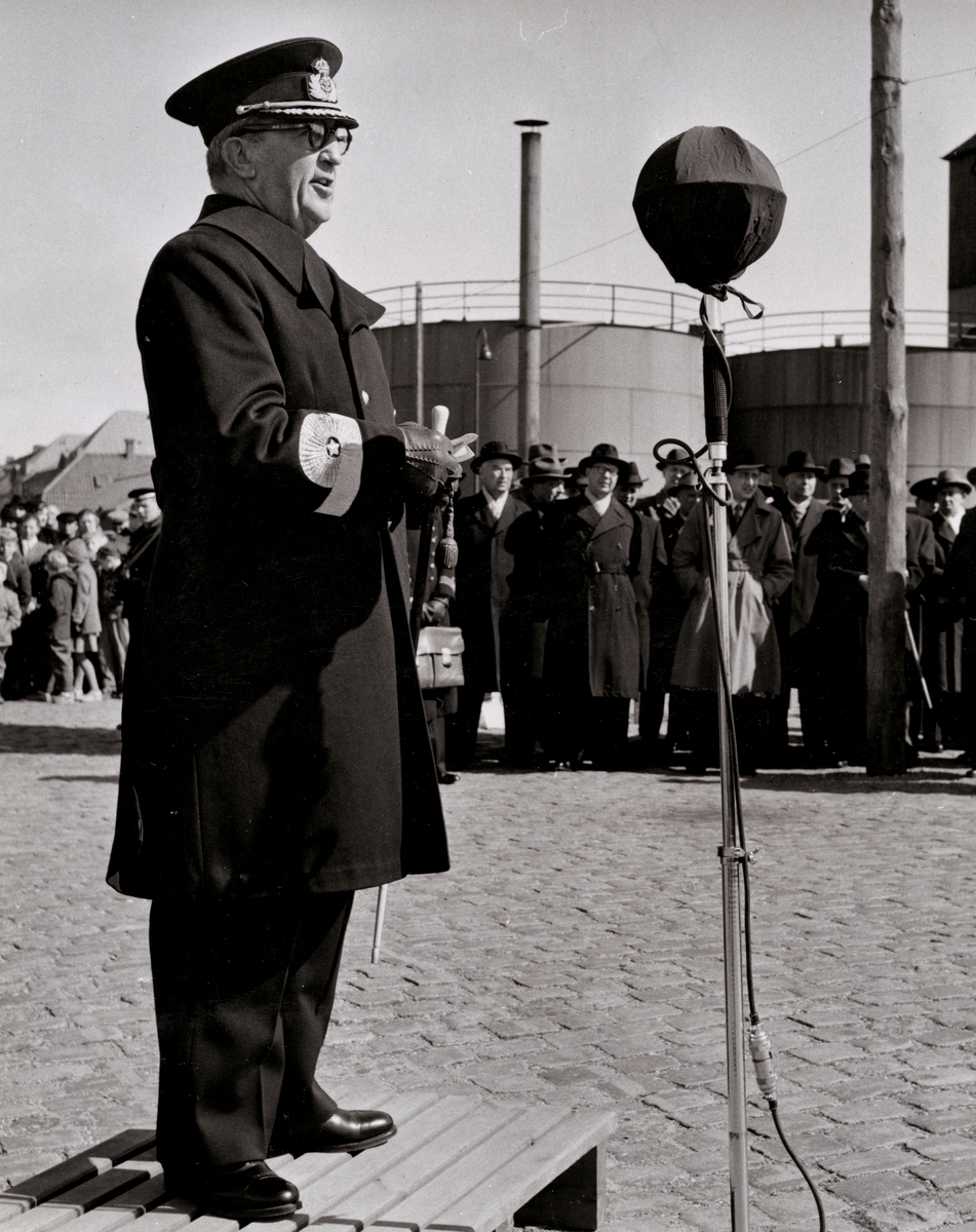 Konteramiral Samuelson, klädd i uniform, står på en träpall och pratar i en mikrofon. Bakom honom syns en civil folksamlling stå och lyssna.