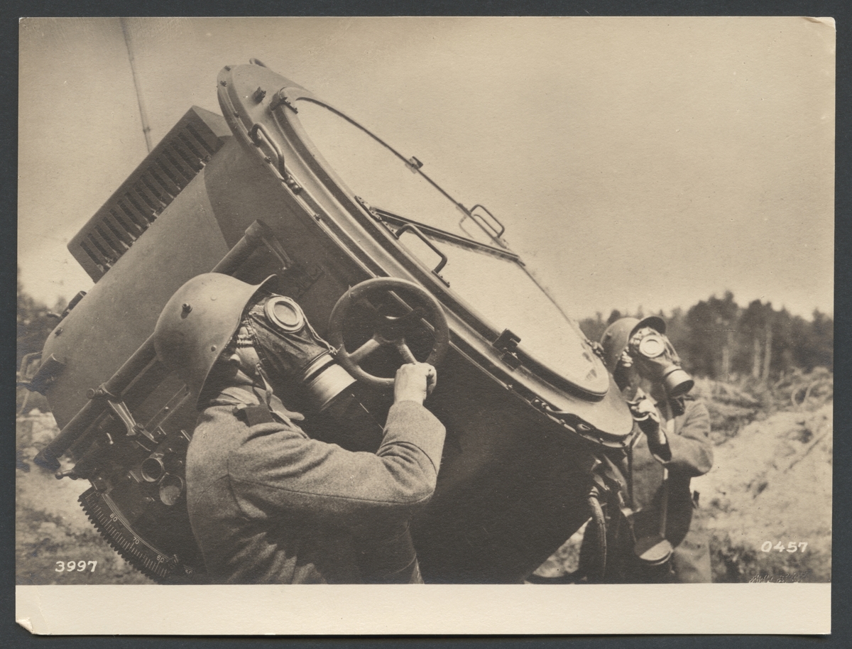 Titel: Bilden visar två soldater som arbetar med en stor strålkastare. Båda bär gasmasker.
