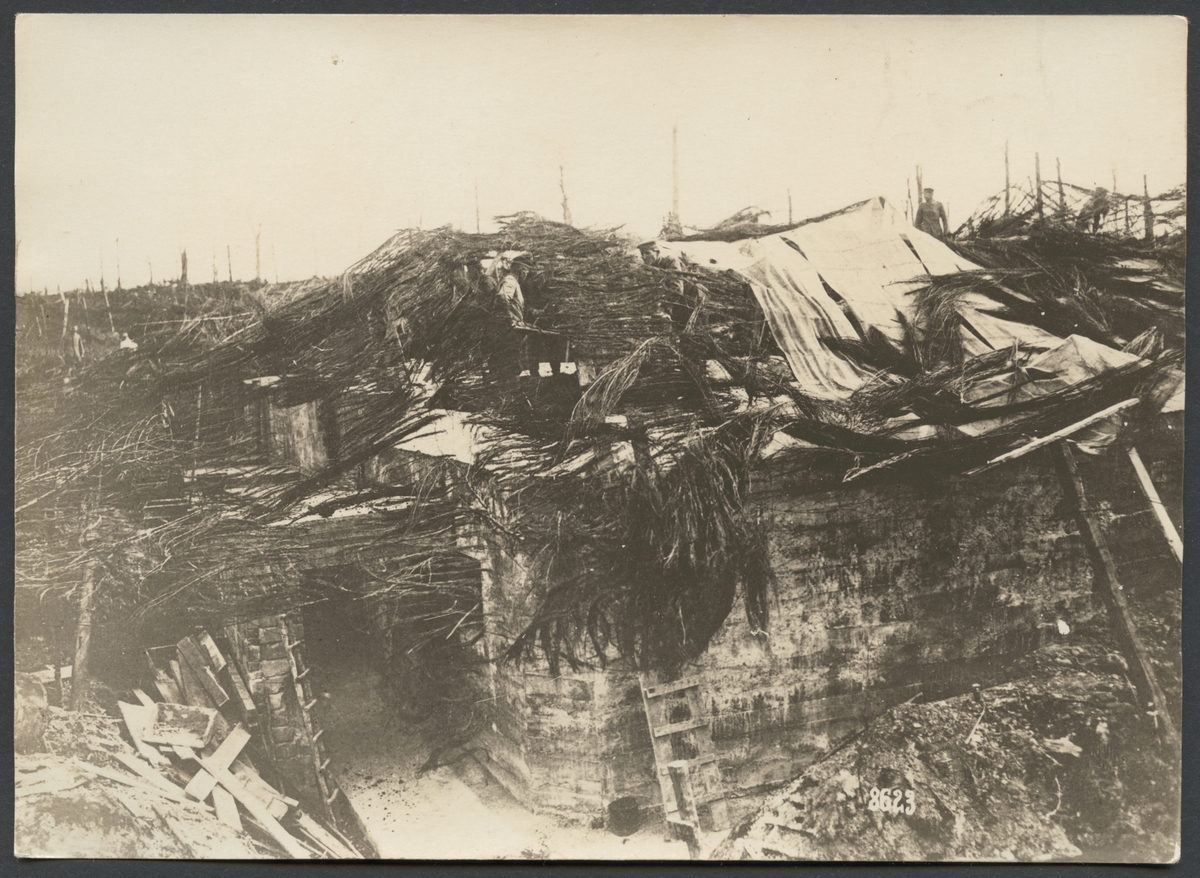 Titel: Bilden visar en bunkeranläggning i armerad betong som är kamouflerad med grenar och tyg.