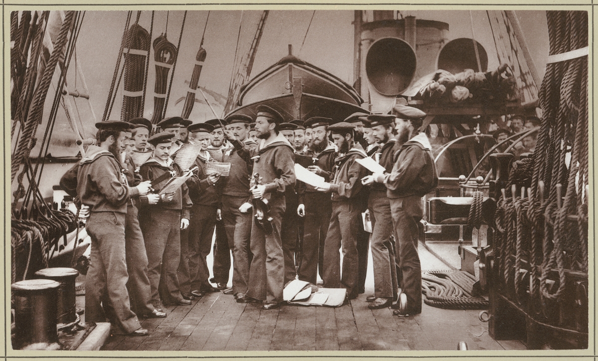 Bilden visar manskapet ombord på korvetten Stosch som sjunger gemensamt under fritiden