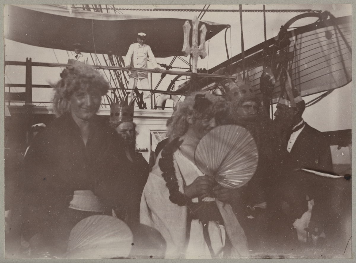 Titel: Bilden visar två sjömän utklädda som kvinnor under linjedopet på Balder.