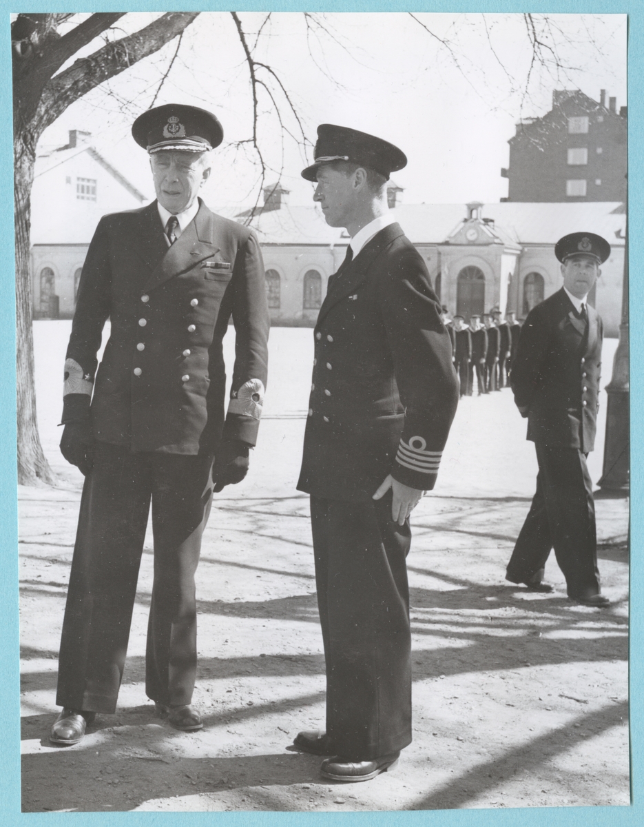 Vice Amiral Strömbäck står utomhus tillsammans med en kommendörkapten av första graden. Båda är uniformsklädda. I bakgrunden syns uppställda flottister och ytterligare en högre officer som går förbi. Längre bak skymtar Bataljon Sparres Excercisbyggnad.