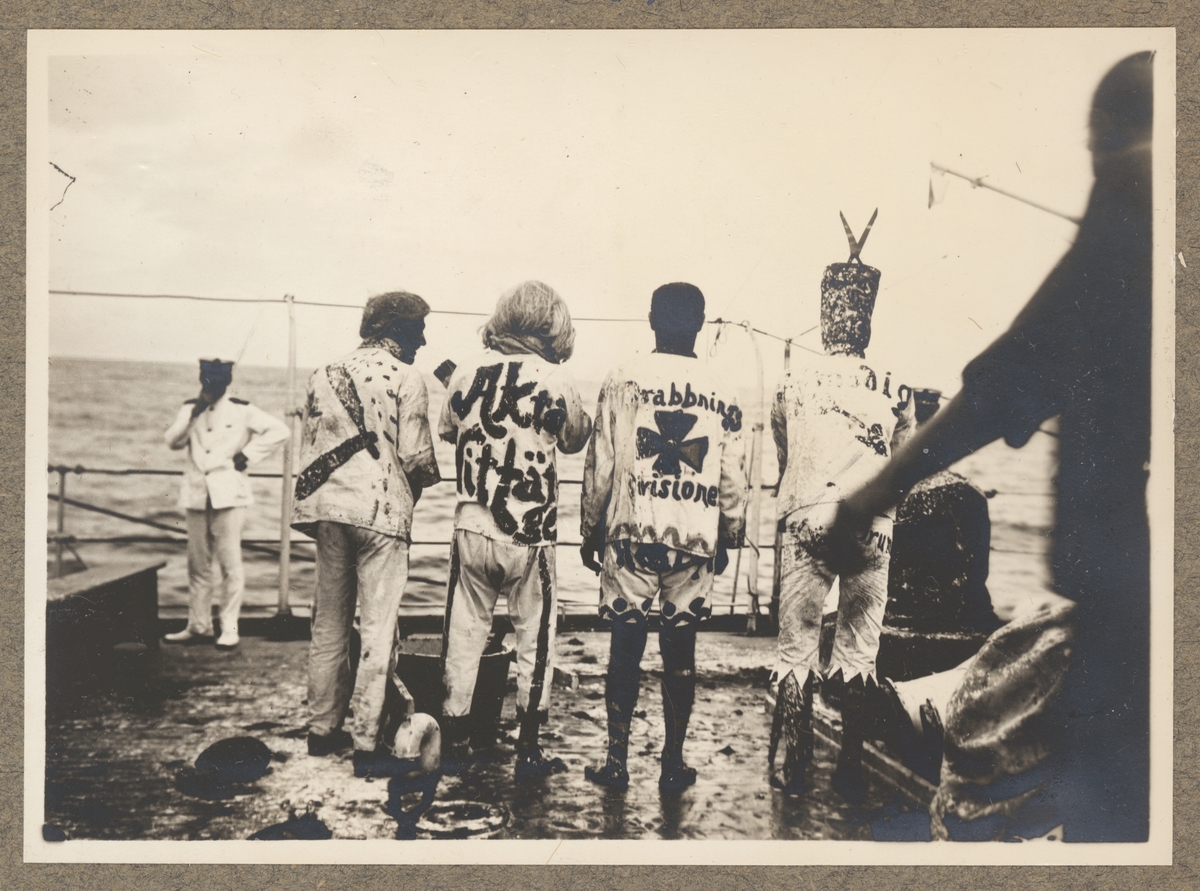 Bilden föreställer en grupporträtt bakifrån av rengöringsgruppen under linjedopet på Fylgia. Det går att identifiera rakaren med rakkniv på ryggen och klipparen med en sax på hatten. De andra är antagligen tvålare.