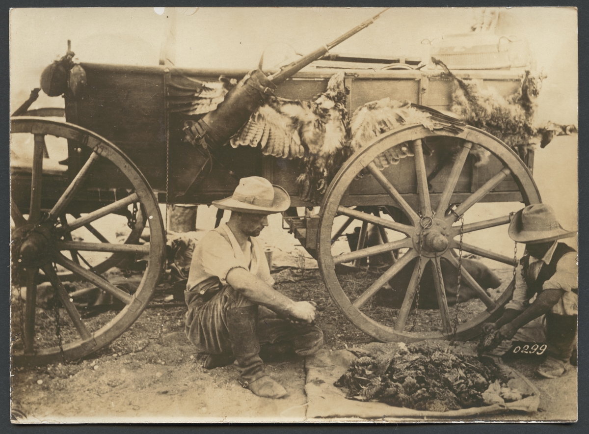 Bilden visar två män sittande på marken framför en hästvagn som tar hand som sitt jaktbyte. Denna består av en hög småfåglar som ligger på den duk. På vagnens sida hänger ett gevär en örn och en pälsdjur.