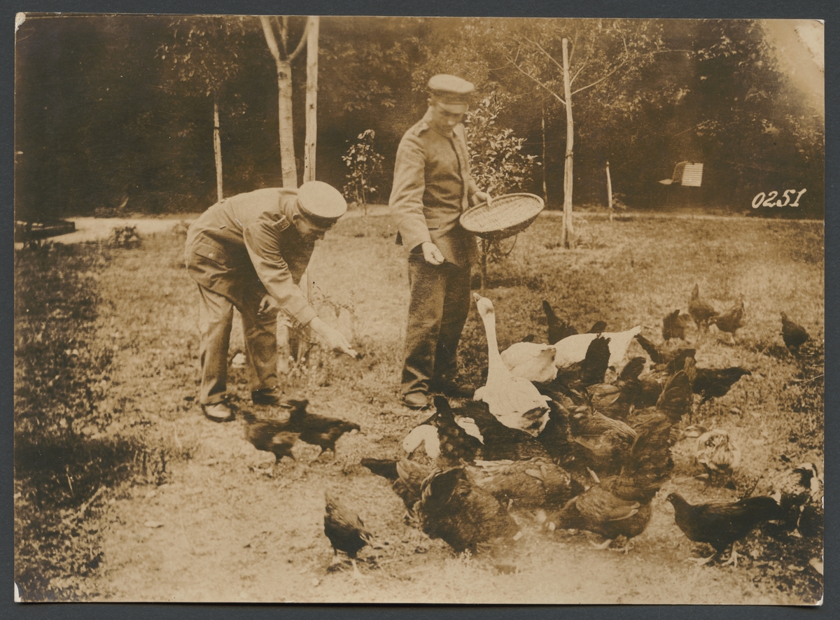 Bilden visar två krigsinvalider som arbetar i en fjäderfäskötsel. De hålla på att mata höns och gäss. Uniformsmössorna avslöjar att de är soldater.