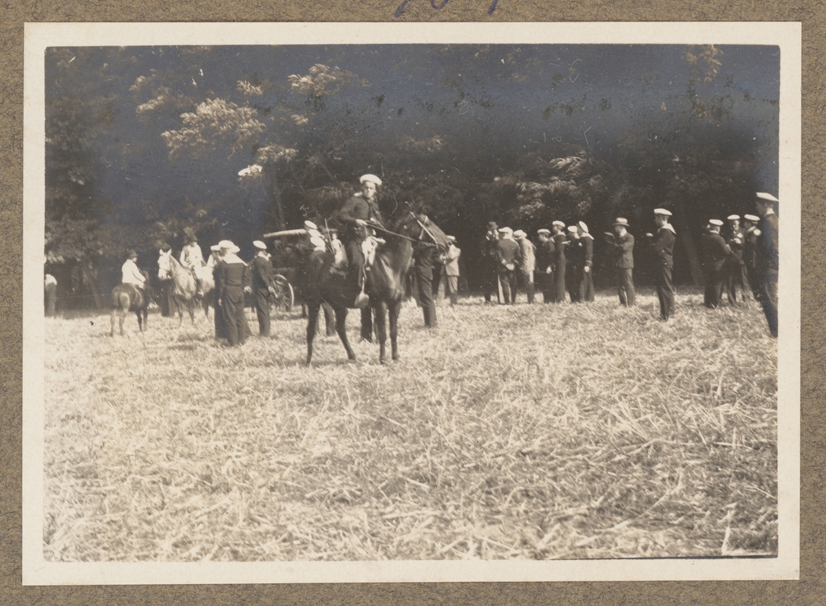 Bilden visar en sjöman som rider en häst. Runt omkring på ängen står andra sjömän i grupper och tittar på de som rider.
