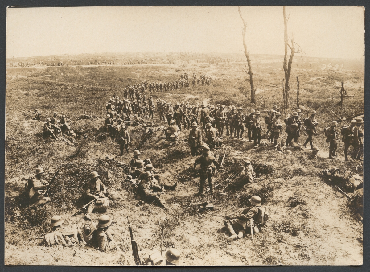 Bilden visar en kolonn tyska soldater som marscherar över ett från granater upprivet slagfält. I förgrunden verka an annan grupp ta en rast i skydd av granathål. I bakgrunden ser man hur ett stort antal soldater rycker fram på bred front.