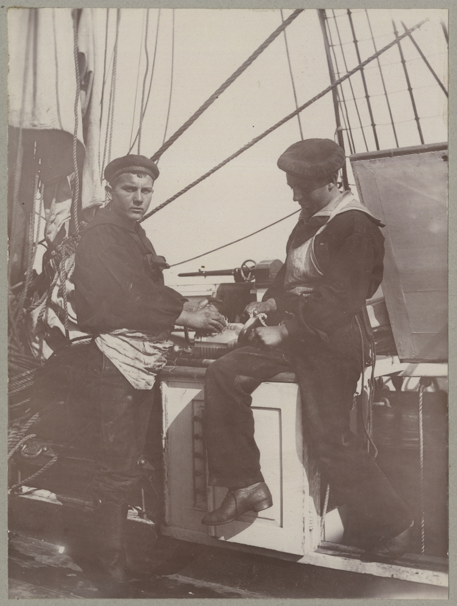Titel: Bilden visar två sjömän som putsar slutstycken av en kanon.