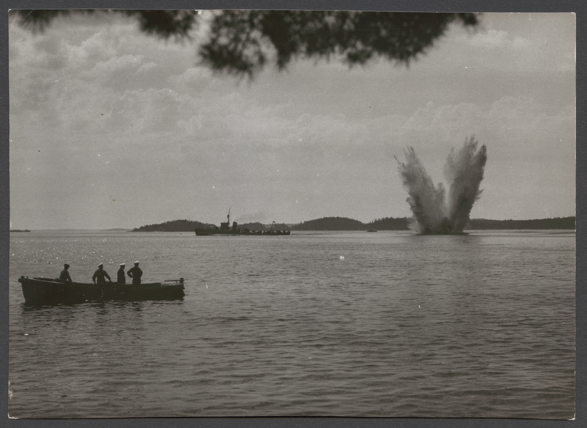 Motiven föreställer en sprängning i kustnära vatten framför en skärgårdskust. I förgrunden på vänster bildkanten ser man ett mindre båt med fyra men som iakttar explosionen. I bakgrunden passerar en mindre kustjagare förbi.