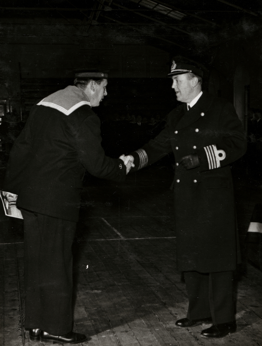 Titel: Sjöman tar kommendör i hand under medaljutdelning.