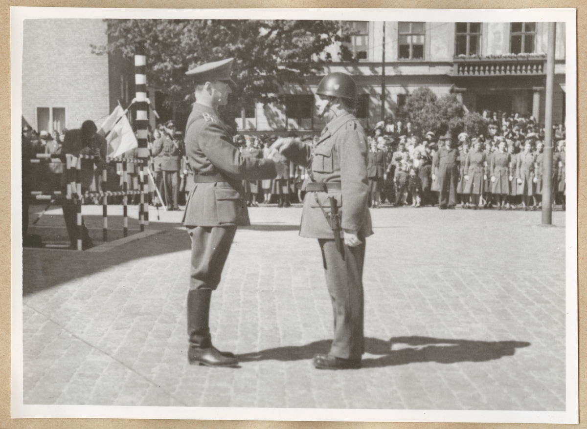 En militär i färd med att ta en hemvärnssoldat i handen. De båda männen är klädda i uniform, den ena med mössa och den andra med hjälm. I bakgrunden står lottor och militärer uppställa och bakom dem syns civila åskådare. Händelsen utspelar sig på stortorget i Karlskrona.