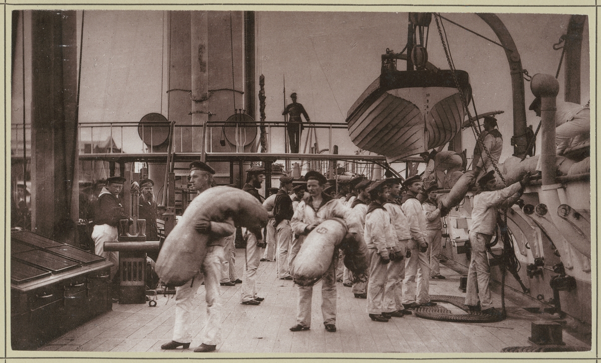 Bilden visar hur besättningen på korvetten Stosch ta emot sina hängmattor. Även ett sådan enkelt aktivitet var sträng reglerat.
