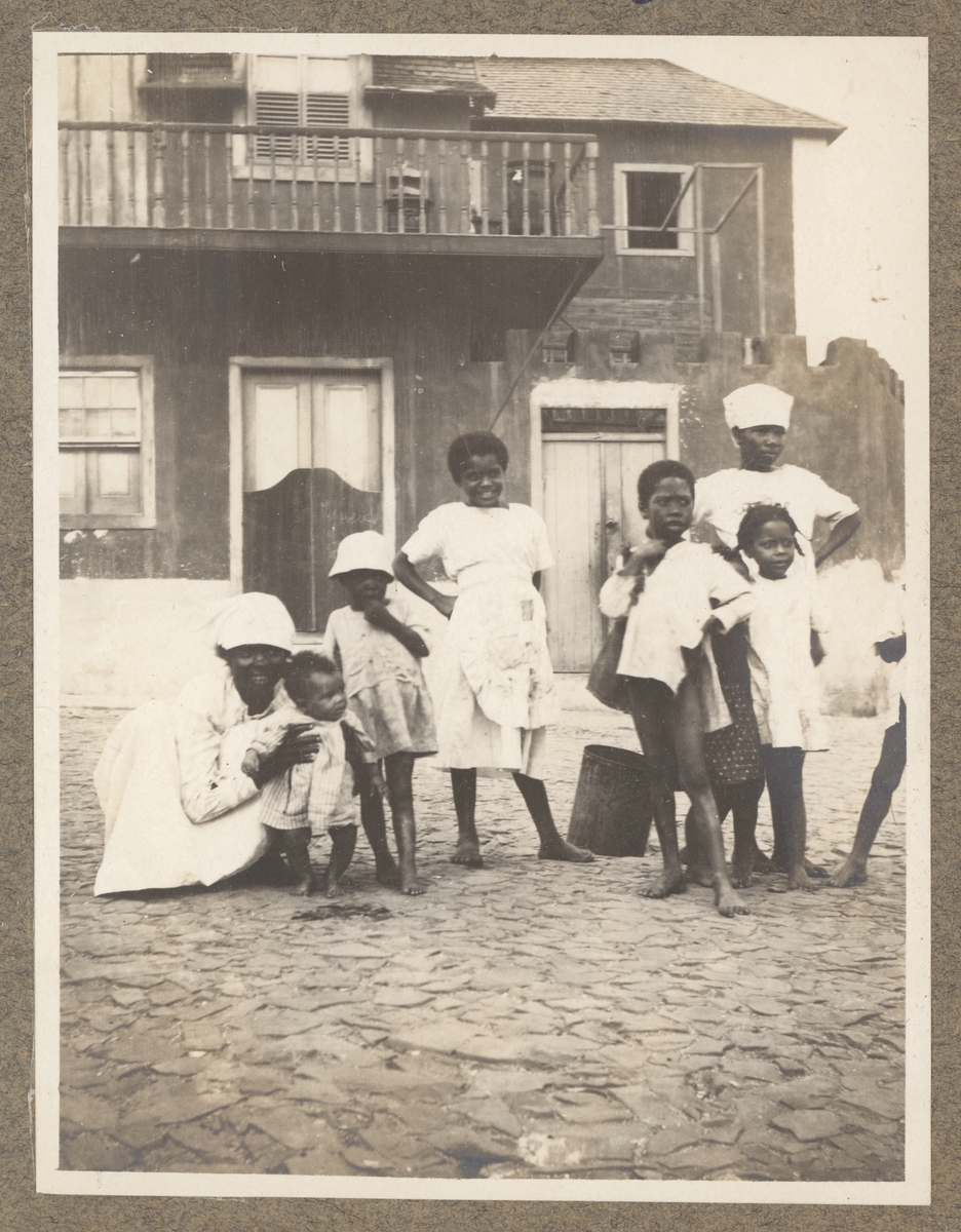 Titel: En svart kvinna med en munter skara barn har tagit uppställning på gatan framför ett hus.