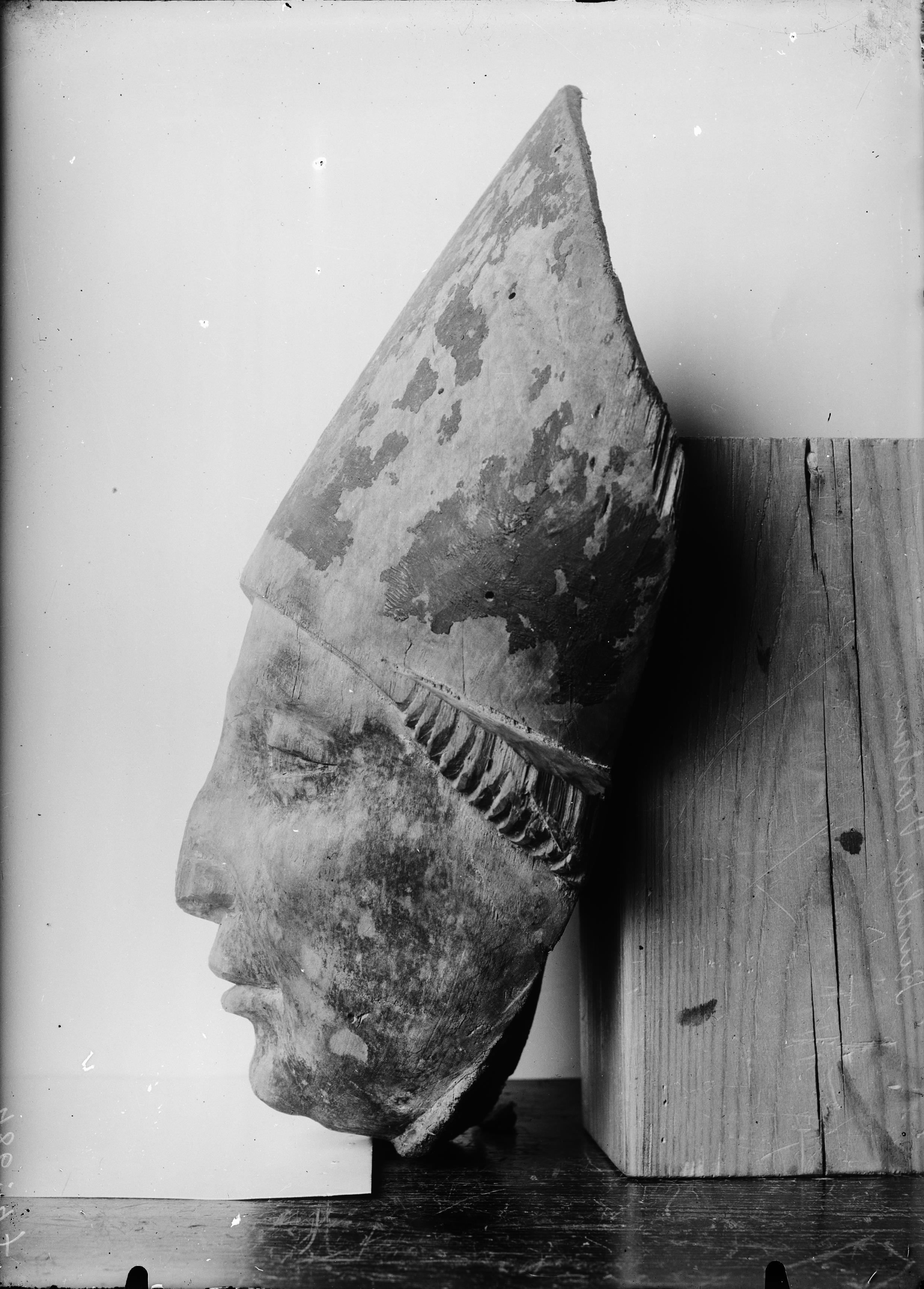 Medeltida biskopshuvud. Mitran lågt över pannan. Huvudet har utförts i två halvor, nackpartiet saknas.