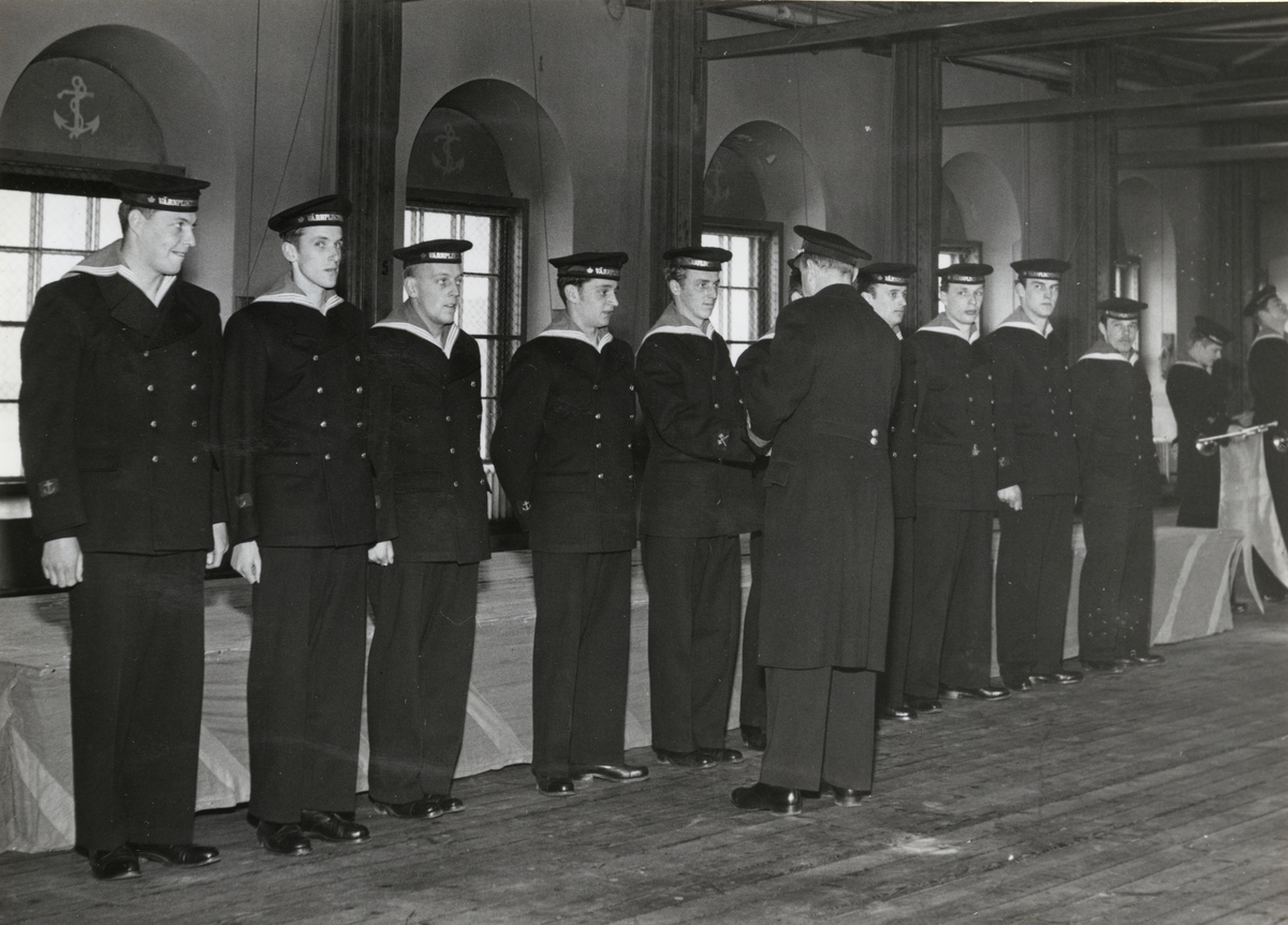 Titel: Matroser mottager medaljer av sjöbefäl under cermoni.