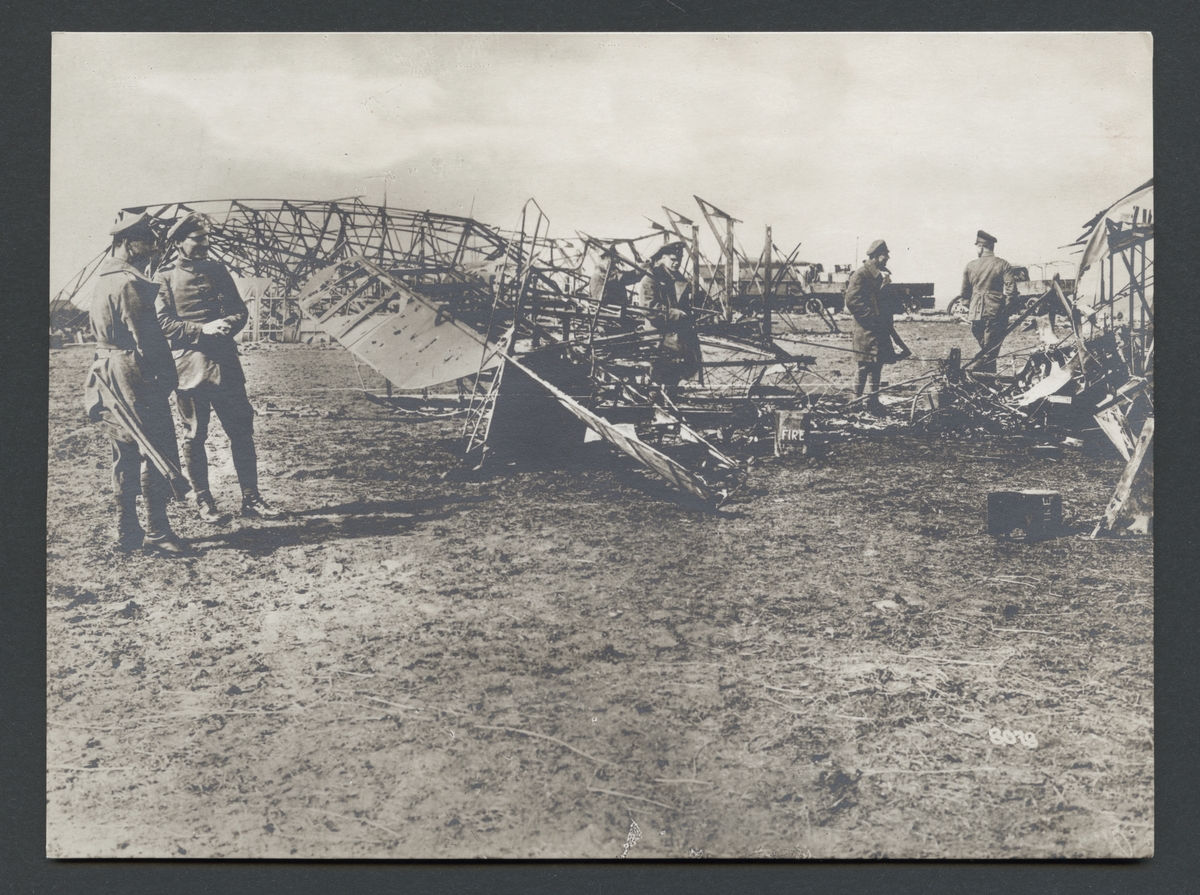 Bilden visar ett förstört engelsk flygfält efter ett anfall där flera soldater betraktar de utbrända flygplanen.
