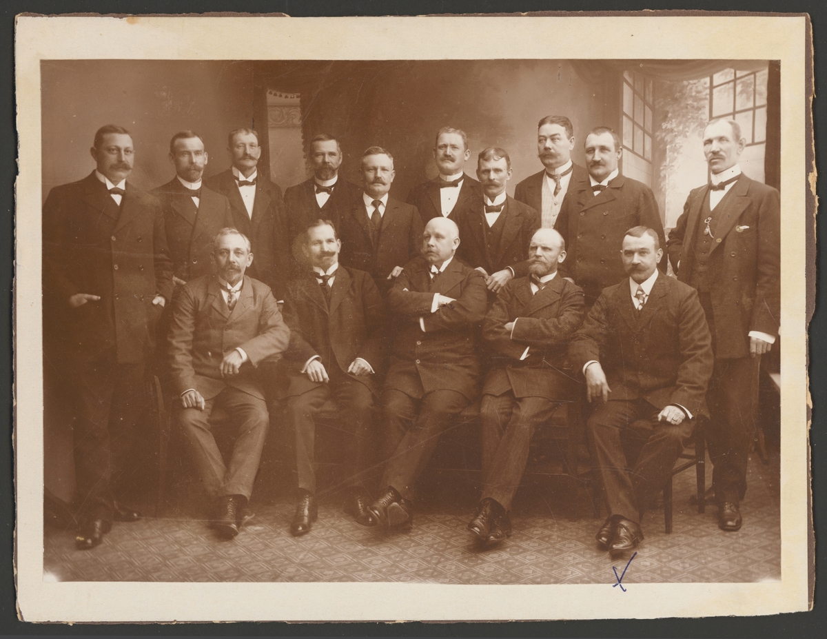 Grupporträtt av okända män som kom in med en dagbok från Svensk-ryska gradmätningsexpeditionen med kanonbåten Svensksund. En person som är märkt på bilden kan vara en av deltagarna men är hittills inte identifierad.
