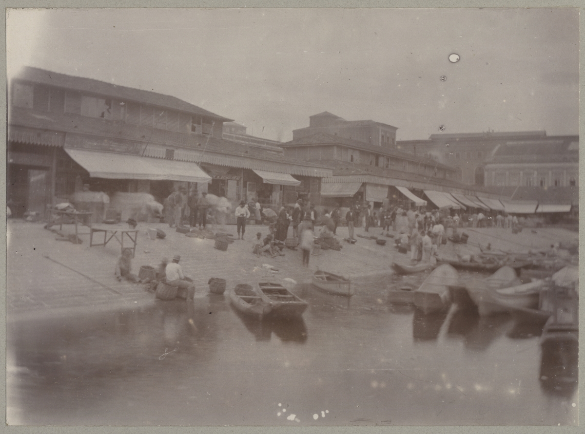 Bilden visar en hamnsituation i en stadsmiljö. Många småbåtar ligger vid en stenlagt strandkant i ett tät bebyggt område.