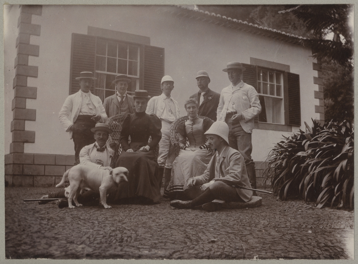 En grupp finklädda människor har samlats framför ett hus på Madeira för ett gruppkort. Två damer sitter i korgstolar. Runt de står och sitter män med halmhattar och tropikhjälmar.