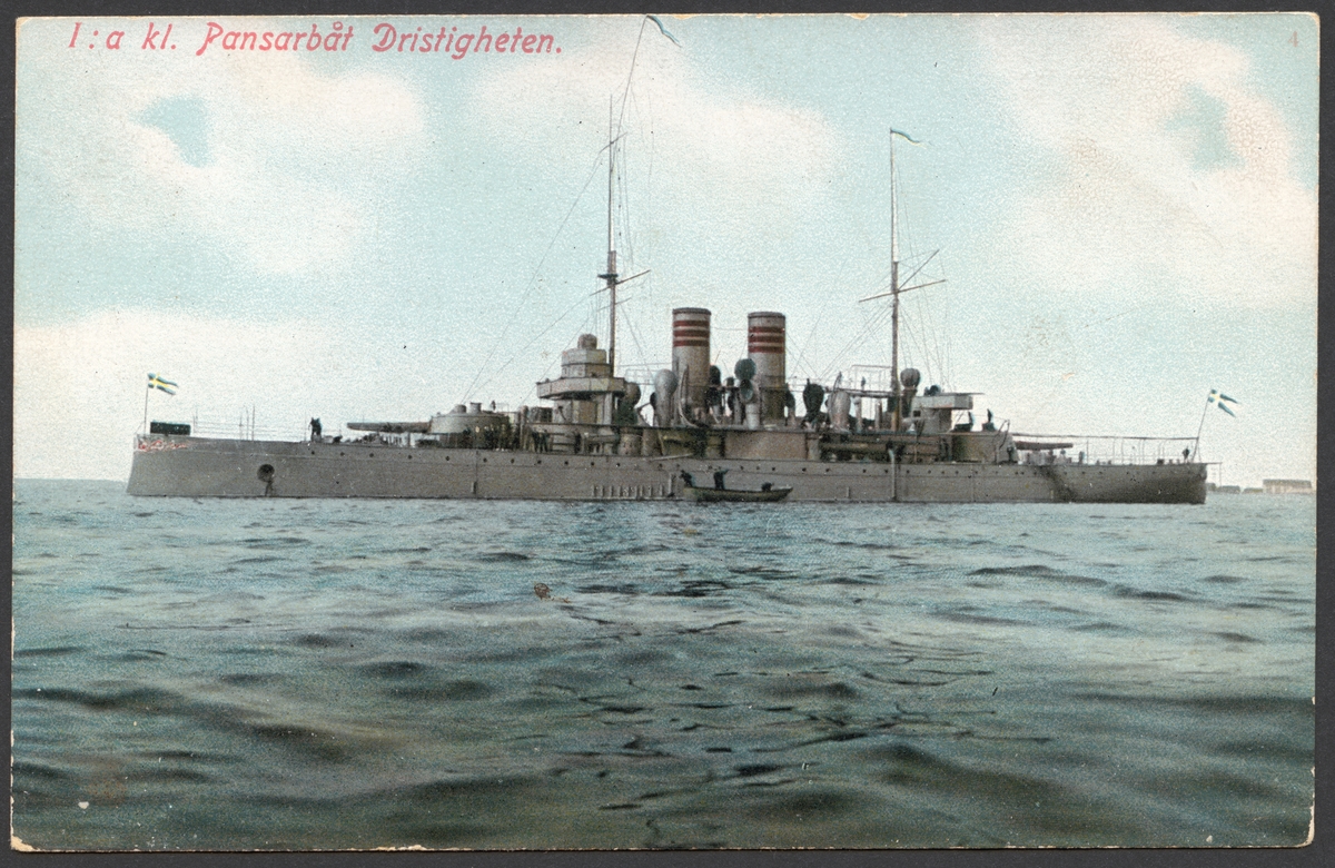 Titel: Vykort som visar 1. klass pansarbåt Dristigheten till sjöss från babordssidan.