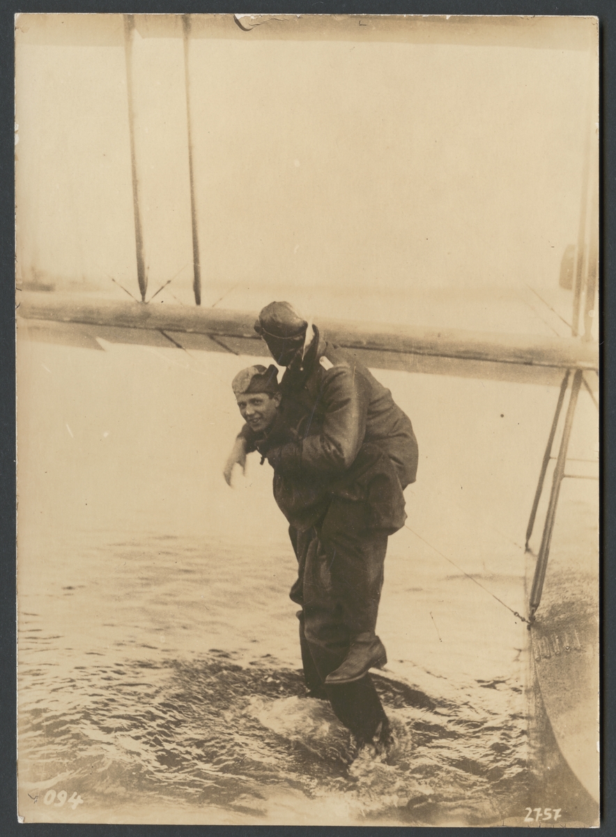 Titel: Bilden visar hur piloten av en sjöflygplan bäras i land av en kamrad.
