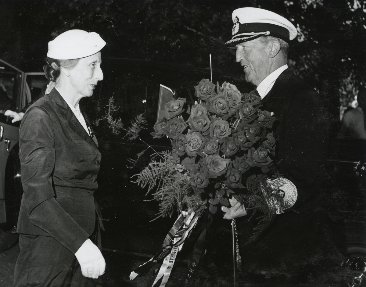 Bild från "Operation Kullen" 24 juli 1955. Konteramiral Samuelson, klädd i uniform, står bredvid drottning Louise med en bukett rosor i famnen.