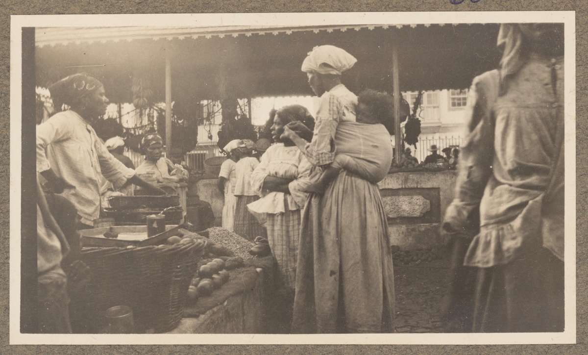 Bilden visar kvinnor från lokalbefolkningen som handlar på en marknad på Kap Verden. Kvinnan i bildens mitt bär ett barn på ryggen.