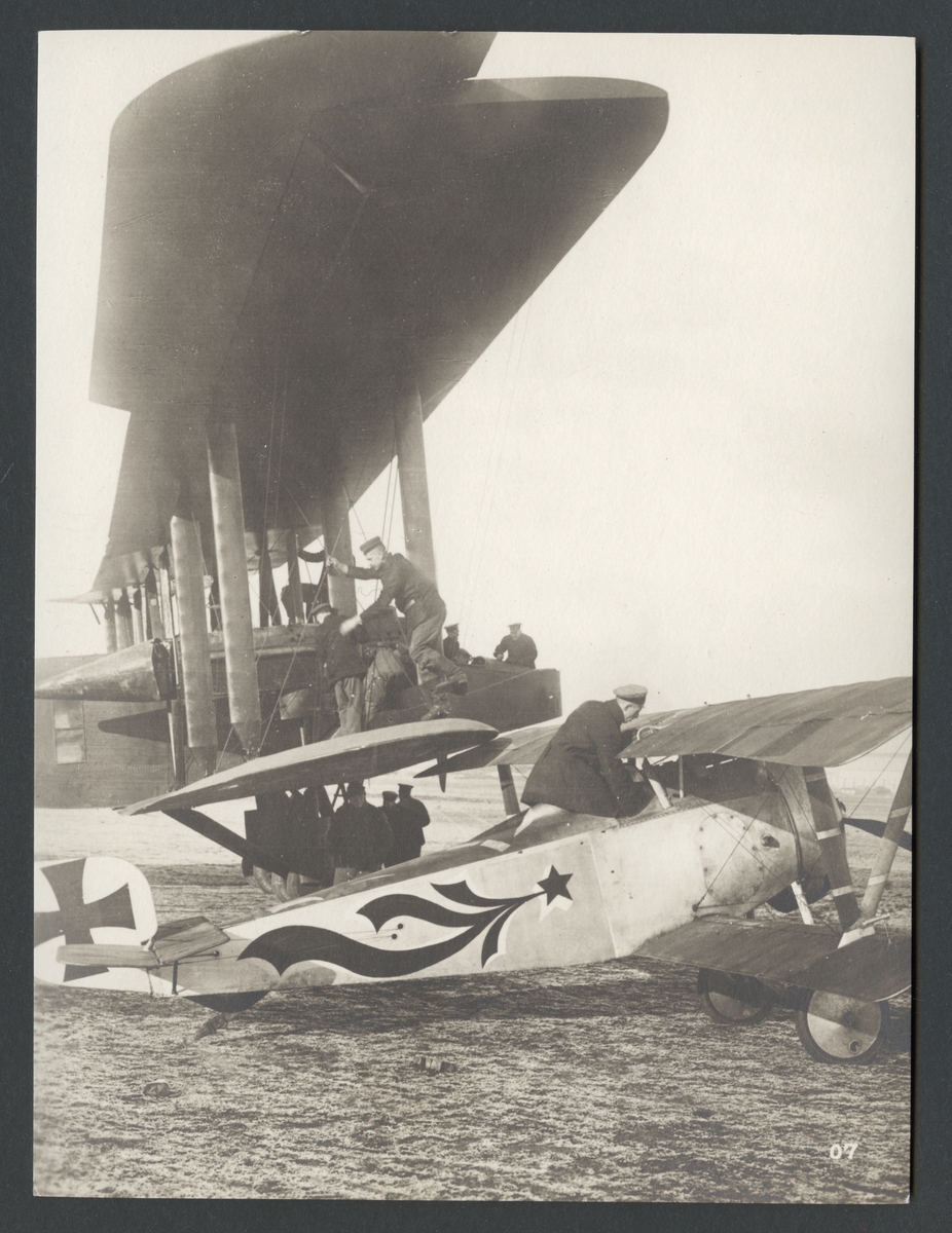 Bilden visar två dubbeldäckare flygplan för att jämföra ett litet jaktflygplan med ett stort bombflygplan. Flygplanen ska enlig bildtext vara krigsbyte.