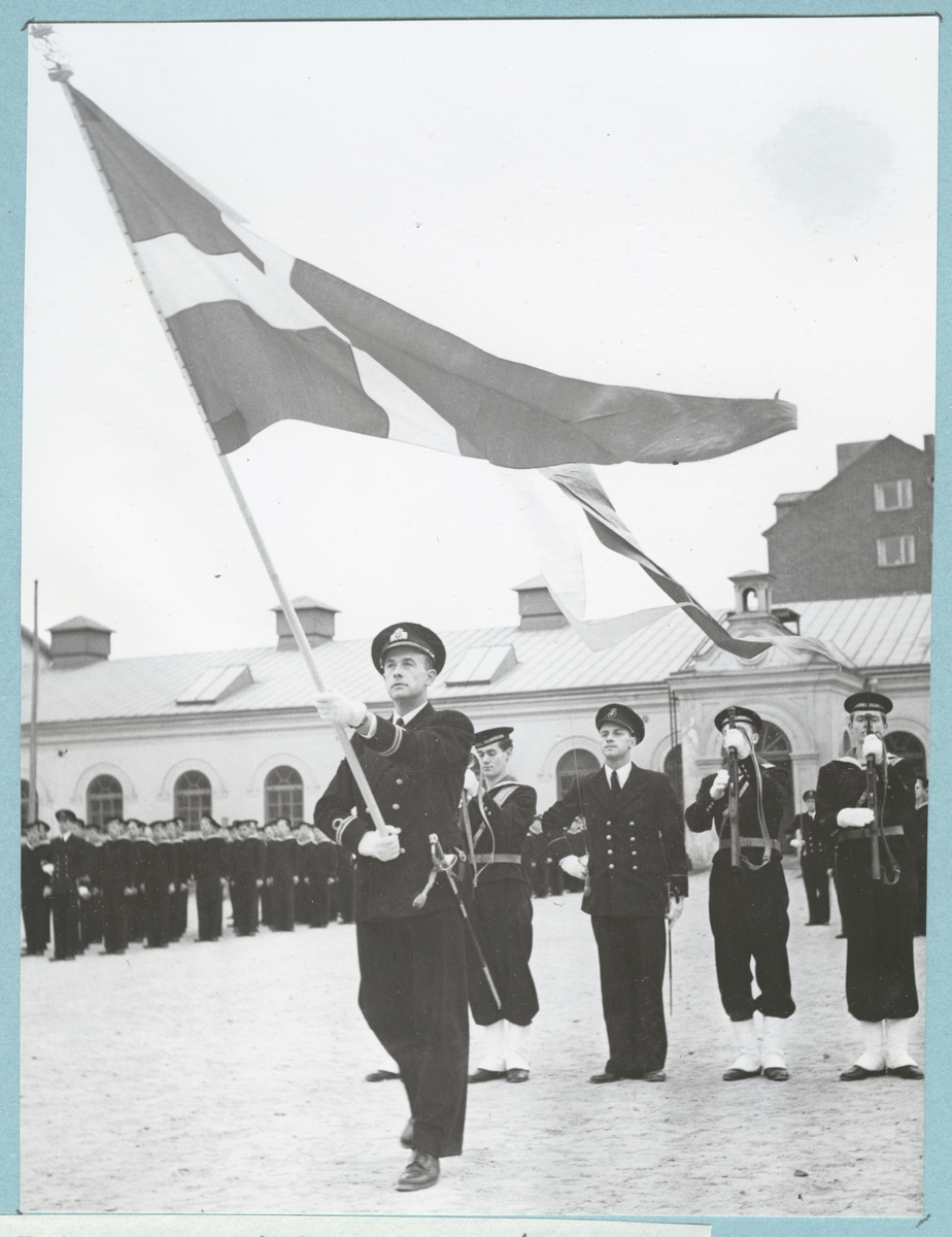 Bilder från Krigsmans erindran den 13/10 1951. En löjtnant går hållandes en stor, svensk flagga. Bakom honom står fyra militärer ur flottan med vapen. I bakgrunden syns Bataljon Sparres excercishus, samt en grupp flottister som står framför på led.